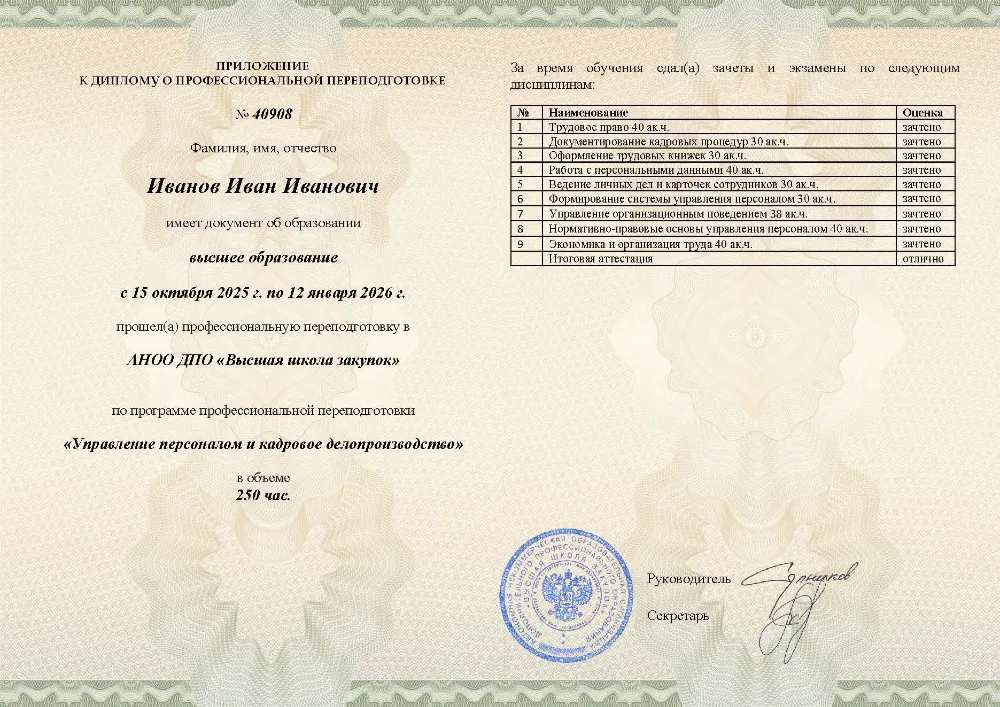 Повышение квалификации, 144 академических часа, 10 модулей: стратегическое кадровое планирование и ситуация на рынке труда, психология управления, документационное обеспечение, развитие, мотивация и вовлеченность персонала, работа с дистанционной занятостью и кадровым резервом. Онлайн-обучение в в Самаре с итоговой аттестацией.