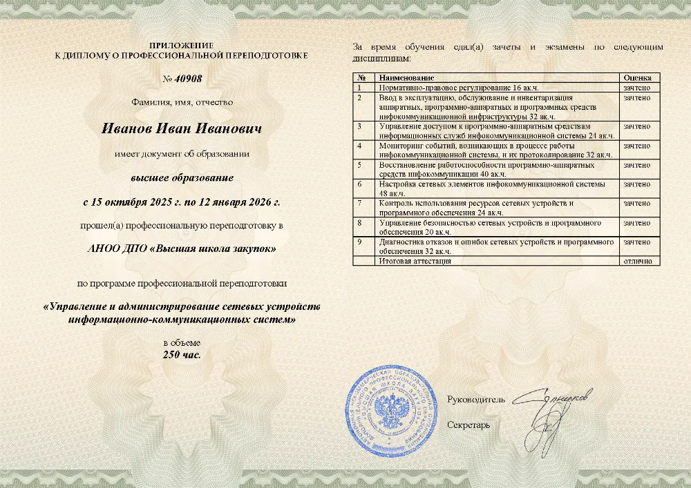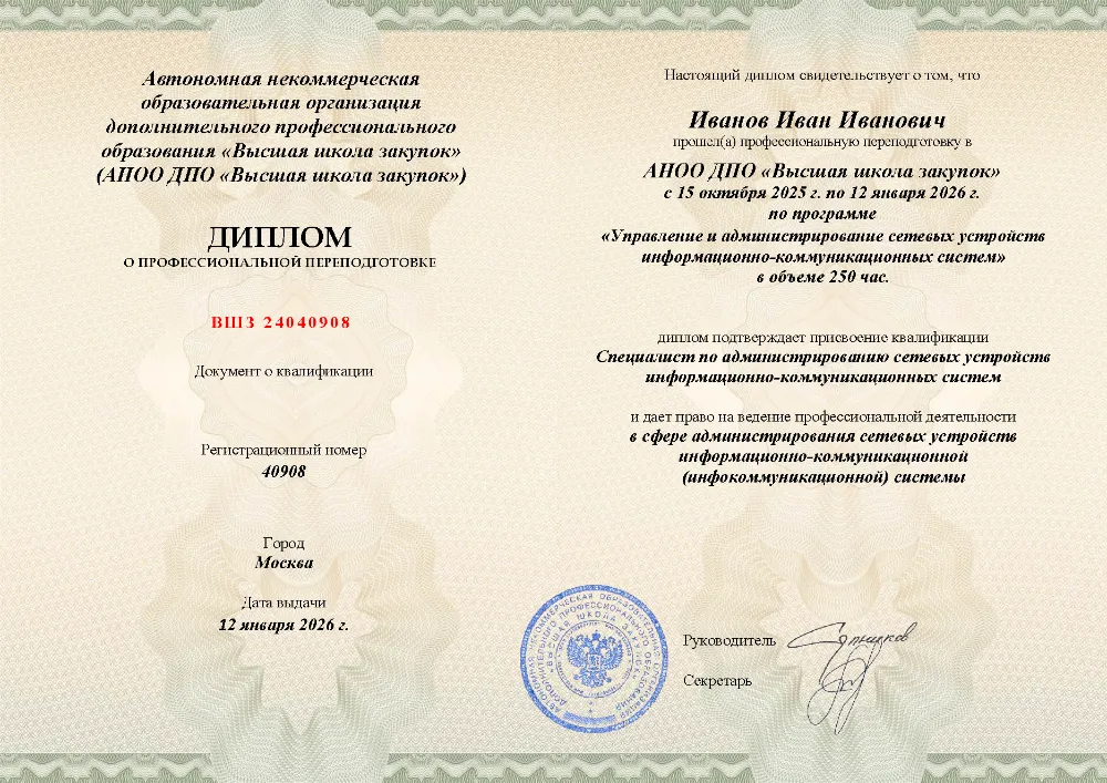 Профессиональная переподготовка, 250 академических часов, 9 модулей: нормативно-правовое регулирование и ввод в эксплуатацию, настройка и мониторинг сетевых устройств, управление доступом и безопасностью, диагностика и восстановление работоспособности инфокоммуникационных систем. Онлайн-обучение в в Самаре с итоговой аттестацией.