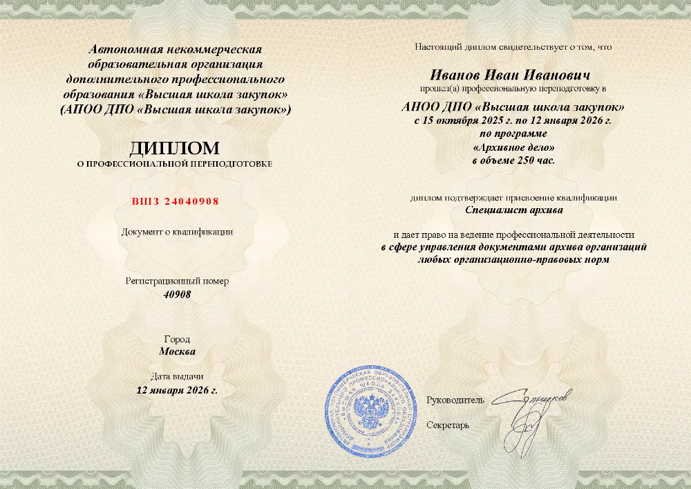 Программа профессиональной переподготовки (250 часов) для специалистов по архивному делу. Освойте правовые основы управления документами, технологии делопроизводства, оцифровку и организацию работы электронного архива с экспертизой ценности документов. Онлайн-обучение в в Самаре с итоговой аттестацией.