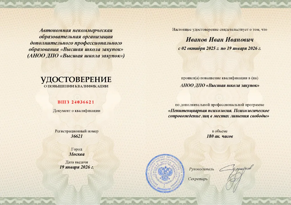 Повышение квалификации, 120 академических часов, 14 модулей: теоретико-методологические основы и нормативное обеспечение, криминальная и виктимологическая психология, судебно-психологическая экспертиза, психология следствия и судебного процесса, работа с осужденными и профилактика правонарушений. Онлайн-обучение в в Самаре с итоговой аттестацией.