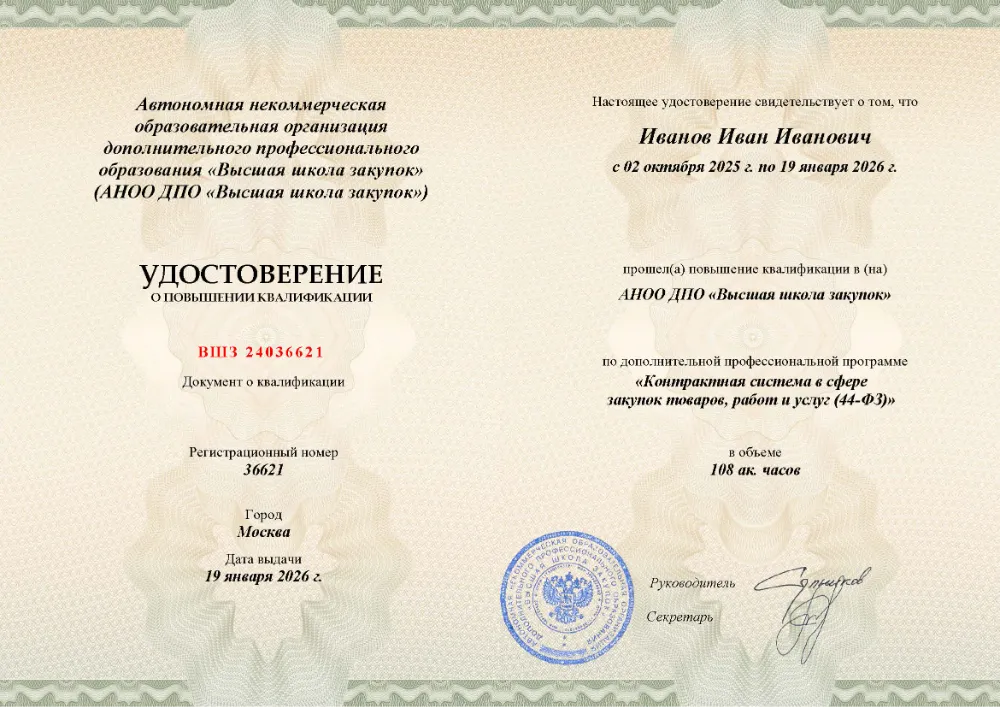 Повышение квалификации, 108 академических часов, 4 модуля: общие положения, принципы и планирование закупок по 44-ФЗ, процедура закупки у единственного поставщика, заключение, исполнение, расторжение и банковское сопровождение государственного контракта. Онлайн-обучение в в Самаре с итоговой аттестацией.